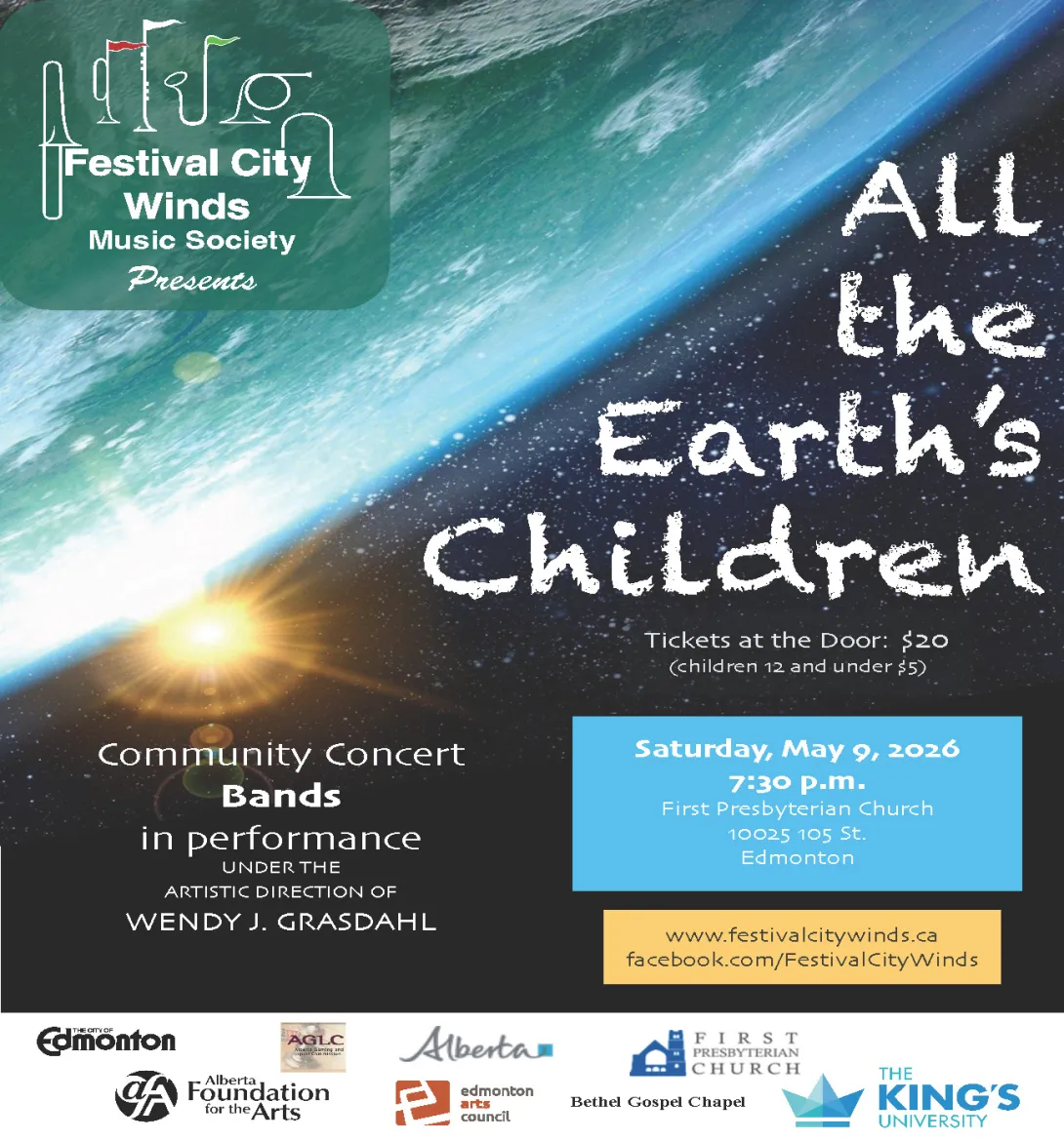Festival City Winds Music Society invites you to come and enjoy its final concert of the regular season entitled All the Earth’s Children under the direction of Wendy J. Grasdahl and Dr. Eila Peterson.