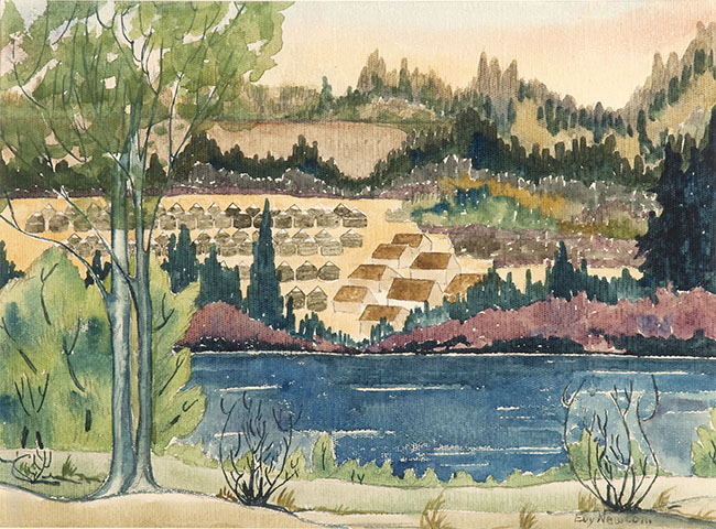 The Alaska Highway Series consists of 34 paintings and was a cooperative effort between Euphemia McNaught and Evelyn McBryan. During 1942 to 1944, both artists travelled along the Alaska Highway as far as the Sikanni River, documenting through sketches and paintings the construction of the highway.