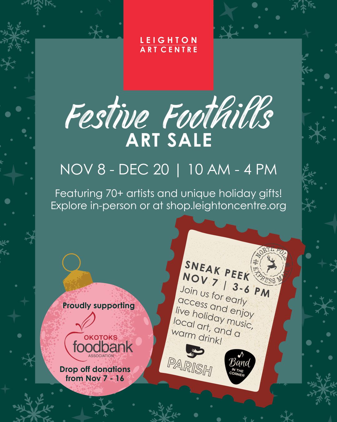 Join us at the Leighton Art Centre for our Festive Foothills Art Sale, a holiday art sale featuring unique, handcrafted gifts by over 70 Alberta artists! From November 8 to December 20, explore original paintings, pottery, glass, textiles, jewellery, and more, all in a stunning foothills setting. Want early access? Don’t miss our Sneak Peek Event on November 7 (3–6 PM) with live music, warm drinks, a raffle filled with local goodies, and the chance to shop before the crowds. Admission by donation; bring a food bank item to support the Okotoks Food Bank!