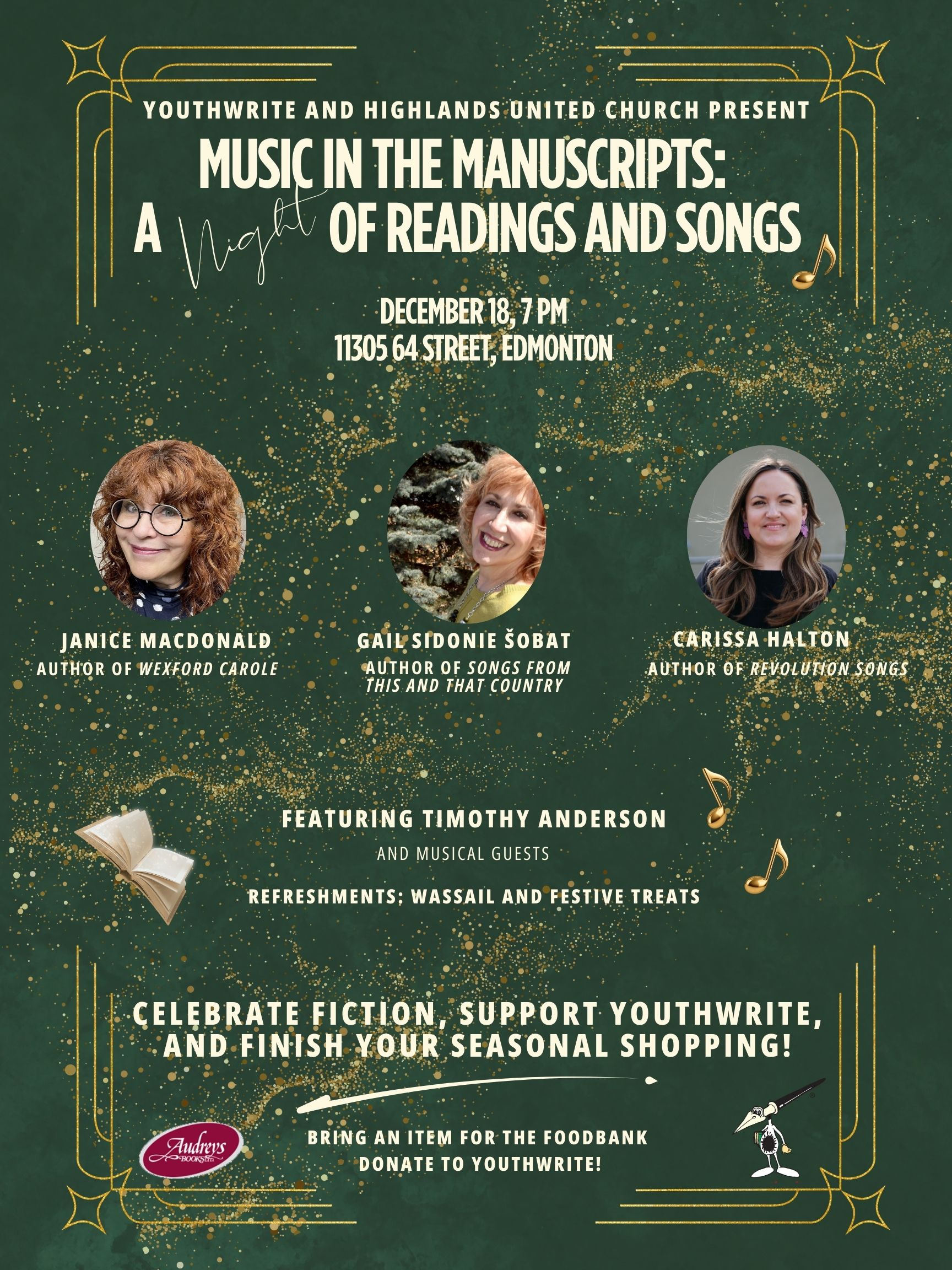 From carols to opera to protest songs, Edmonton authors Janice MacDonald, Gail Sidonie Šobat, and Carissa Halton will share how music inspired their stories. Readings will be punctuated by music and singing (with special guests) in the sonorous sanctuary of Highlands United Church.
