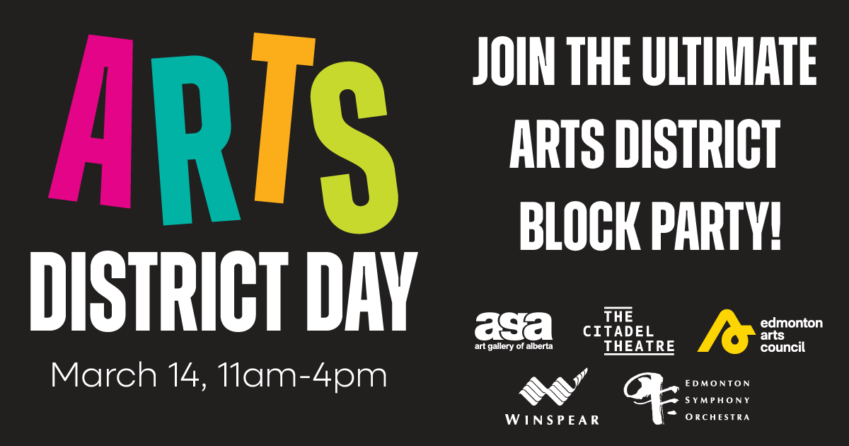 Join us on March 14, 2026, for our first Arts District Day—an open invitation to explore downtown’s Arts District and our neighbours around the district. Enjoy free events hosted by the Art Gallery of Alberta, the Winspear, and the Citadel Theatre, with more details coming soon. Experience a place where music, stories, and art connect us all. Everyone’s welcome. Come feel the energy.
