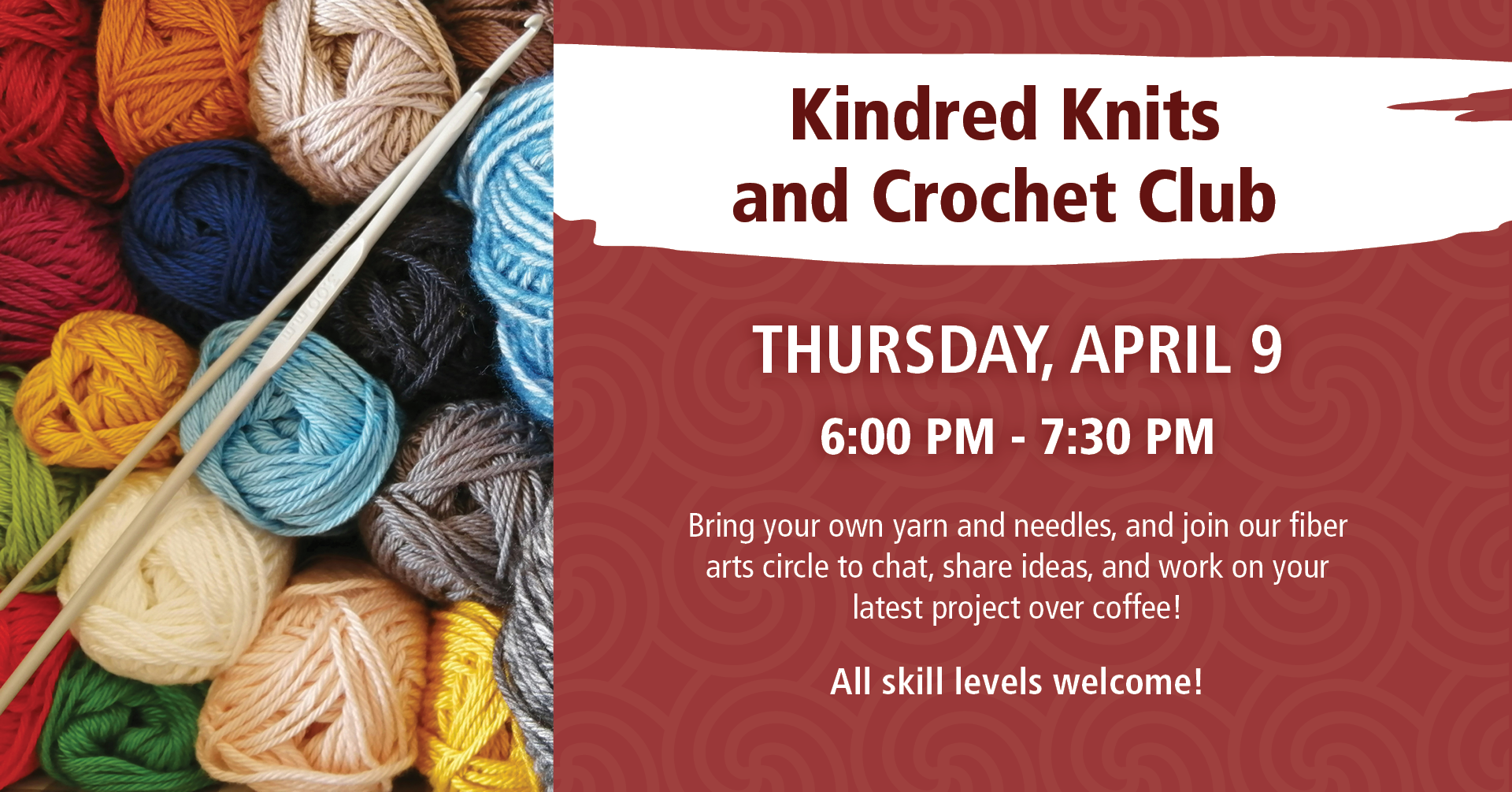 BYOY (Bring your own yarn!) and needles and join a fibre arts circle to share ideas, patterns, and chat over coffee while working on your latest project! All skill levels (including newbies!) welcome.