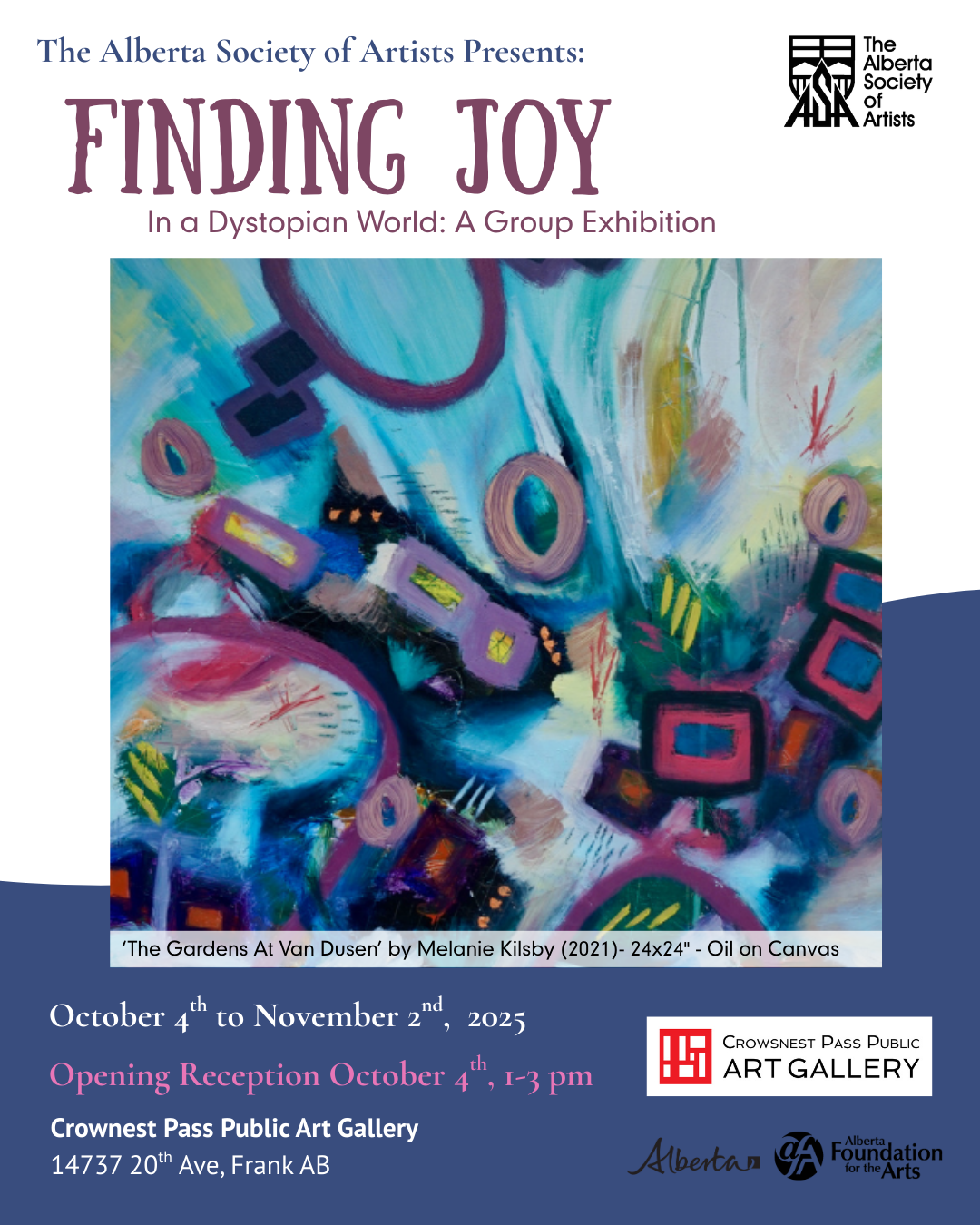 The Alberta Society of Artists is pleased to present the group exhibition “Finding Joy in a Dystopian World” featuring the work of artists across Alberta. The exhibition runs October 4th – November 2nd, 2025 at the Crowsnest Pass Public Art Gallery, 14737 20th Ave, Frank, AB. Gallery hours are: Monday - Friday 12pm - 4pm, Saturday & Sunday (or Holidays) 1pm - 4 pm. There will be an opening reception held on October 4th, 2025, from 1-3pm. ‘A dystopian world is one that often feels devoid of reason, a reflection of some of the struggles we face today. In such a world, how do we navigate without losing our sense of hope? Can we discover joy through the power of ideas, knowledge, and creativity?Is it possible to imagine a future where compassion, equality, and the resilient human spirit triumph over despair? We invite you to explore and express your vision: what brings you joy, inner peace, and hope in the face of adversity? How do you find light in the darkness? What can we learn from dystopia, and how can we shape a more hopeful future through art?” “This will be our reply to violence: to make music more intensely, more beautifully, more devotedly than ever before.” – Leonard Bernstein, on the occasion of the death of President John F. Kennedy.’ For more information, go to https://www.albertasocietyofartists.com/finding_joy/ , email coordinator@albertasocietyofartists.com, or call the Gallery at 403-265-0012. The Alberta Society of Artists is the oldest society of juried professional artists in the province, providing art education and exhibitions in public venues since 1931. The Society’s goal is to increase public awareness and appreciation of the visual arts in Alberta.