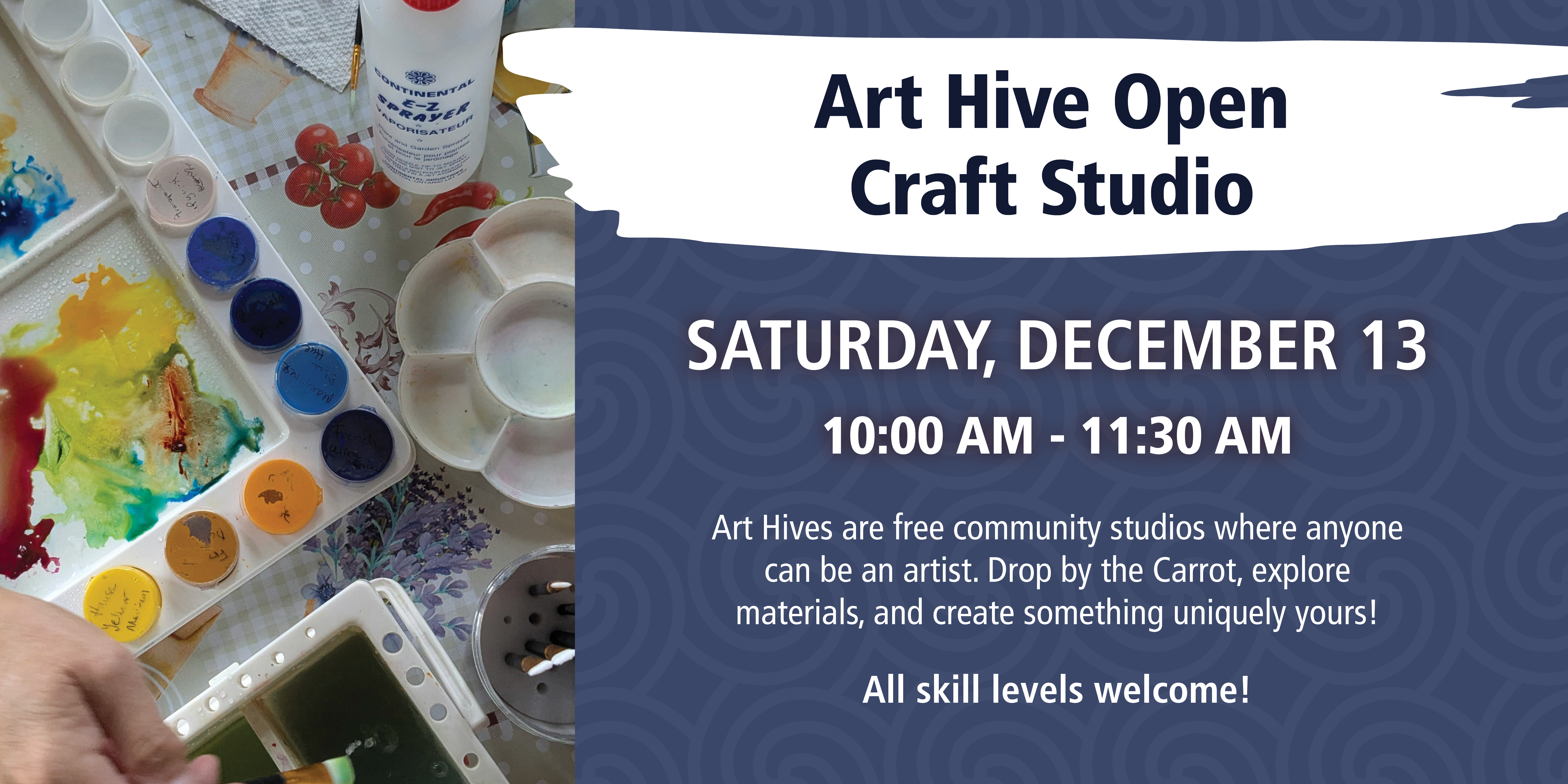 Art Hives are a global movement that create free community studios where anyone is welcome to be an artist. Drop by, discover materials, and create something unique to you at the Carrot!