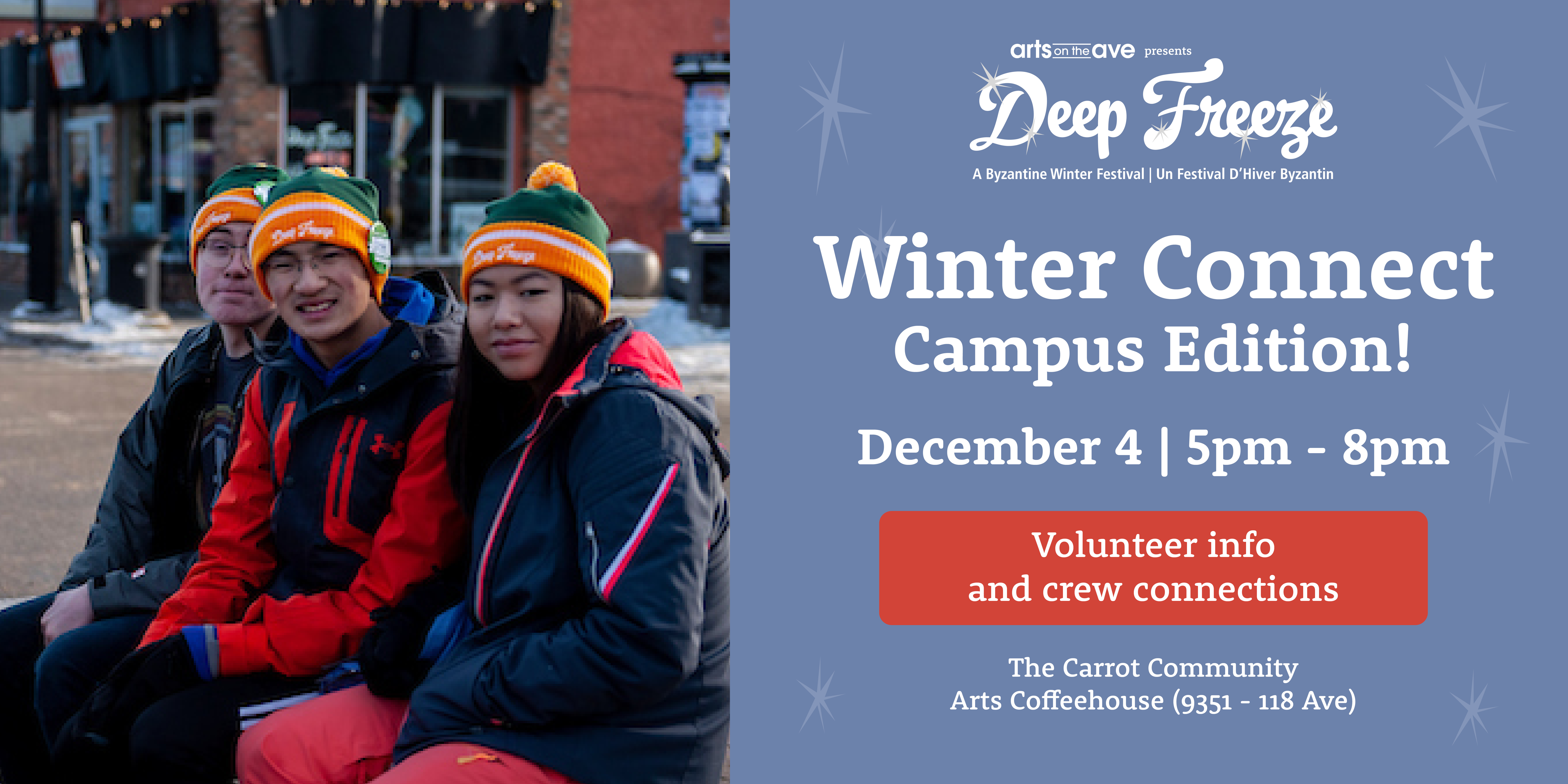 Winter Connect: Campus Edition is a special evening info session on Thursday, December 4th with two sessions: One at 5:00pm and one at 6:30pm. Sign up for a drop-in gingerbread competition, free hot drinks and snacks, and meet crew leads to learn more about Deep Freeze: A Byzantine Winter Festival. This info session is designed with students in mind, so bring some friends and come down to the Carrot to learn about January volunteer opportunities!