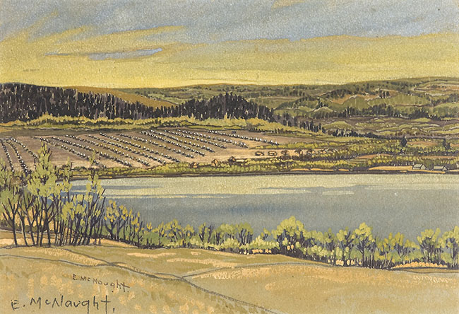 The Alaska Highway Series consists of 34 paintings and was a cooperative effort between Euphemia McNaught and Evelyn McBryan. During 1942 to 1944, both artists travelled along the Alaska Highway as far as the Sikanni River, documenting through sketches and paintings the construction of the highway.