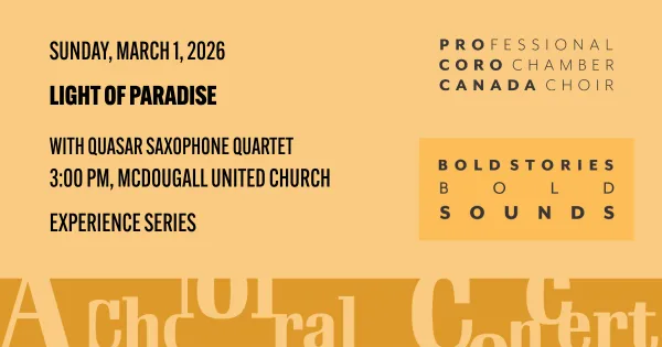 Pro Coro Canada is honoured to present the North American premiere of Paul Mealor's choral opera The Light of Paradise. This awe-inspiring choral work for choir, soloists, and saxophone quartet will feature the internationally acclaimed Quasar Saxophone Quartet from Montreal.