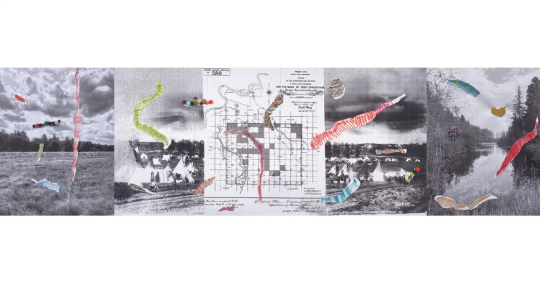 Her artwork for the ETS shelter uses torn copies of archival images of an Indian Affairs Papaschase reserve survey map from 1899 and a photograph taken prior to 1907 of Indigenous men and tipis on the grounds of Fort Edmonton. The artist then mended the torn imagery using embroidery thread, caribou tufting, porcupine quills and beadwork.