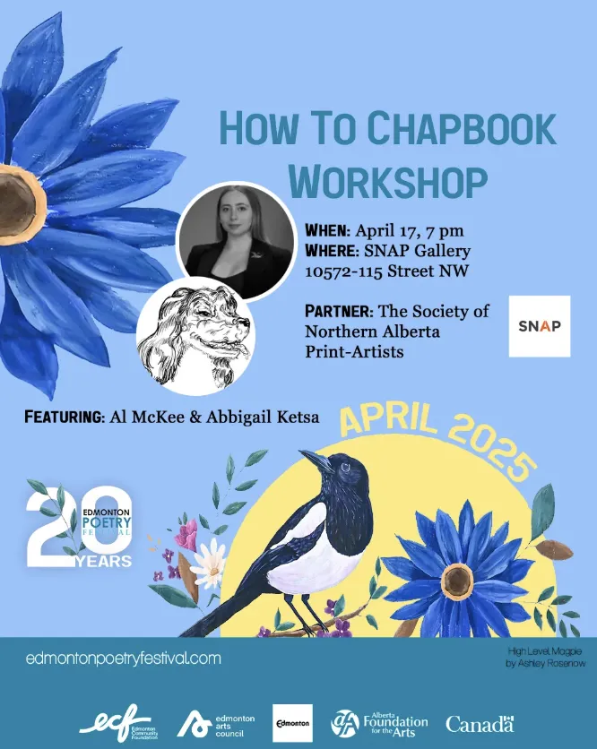 Join the Edmonton Poetry Festival Society at The Society of Northern Alberta Printmakers (SNAP) Gallery for an exploration of why-wait-to-be-published-when-you-can-do-it-yourself chapbook production. Facilitators Big Al and Abbigail Ketsa offer a sample of some of the methods you could borrow or straight-up steal to create, decorate, and procreate your own unique chapbook.