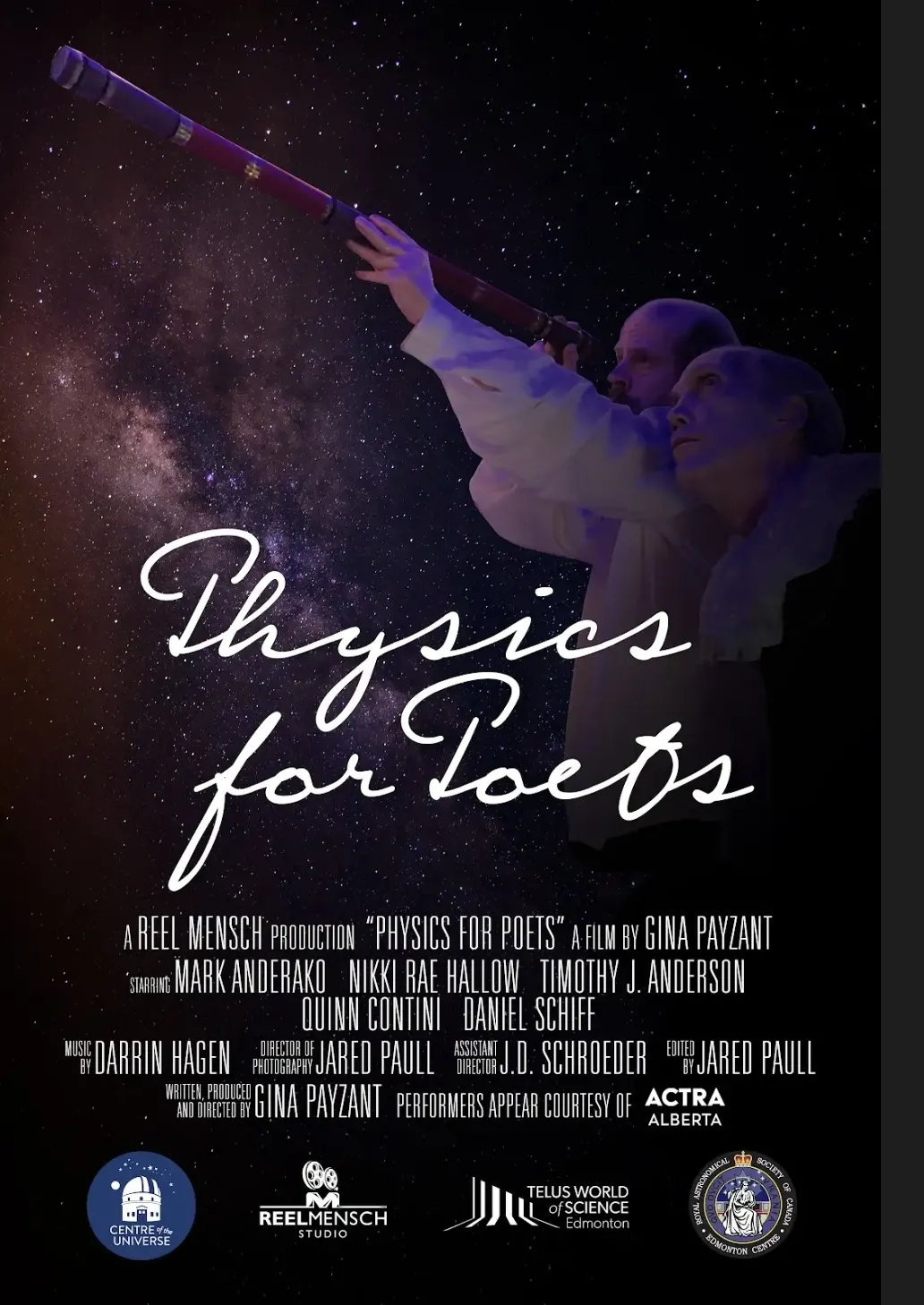 Reel Mensch Studio is the creative home of writer and director Gina Payzant, supporting the development and production of independent, research-driven films that explore the intersection of science, history, and art. Physics for Poets was made possible through the collaboration of dedicated Alberta artists and technicians, with production support from the Film and Video Arts Society of Alberta (FAVA), ACTRA, post-production support from the National Film Board, Filmmaker Assistance program, and guidance from science and arts organizations including the Royal Astronomical Society of Canada and Telus World of Science Edmonton.