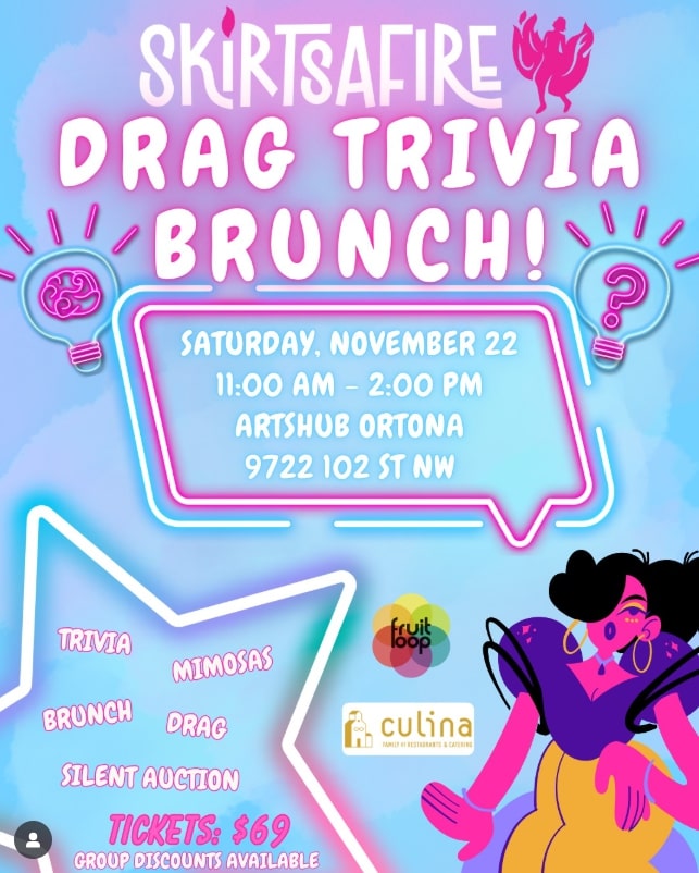 Gather your besties and put on your thinking caps for SkirtsAfire’s Drag Trivia Brunch, our Annual Fundraiser! You won’t want to miss our epic fundraising event on November 22 at ArtsHub Ortona featuring trivia with our host and DJ Sponsored by Fruit Loop, buffet-style brunch thanks to Culina Catering, a complimentary mimosa or mocktail, and access to fabulous Silent Auction items to bid on! And in the spirit of fundraising, you’ll have opportunities to pay to “hint or hinder” throughout the event to give your team an edge… or sabotage another.