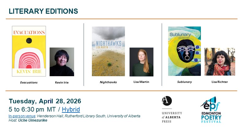 This poetry event will feature readings from University of Alberta Press’ newest collections: Sublunary by Lisa Richter, Nighthawks by Lisa Martin, and Evacuations by Kevin Irie. Our host is Uche Umezurike, author of there’s more.