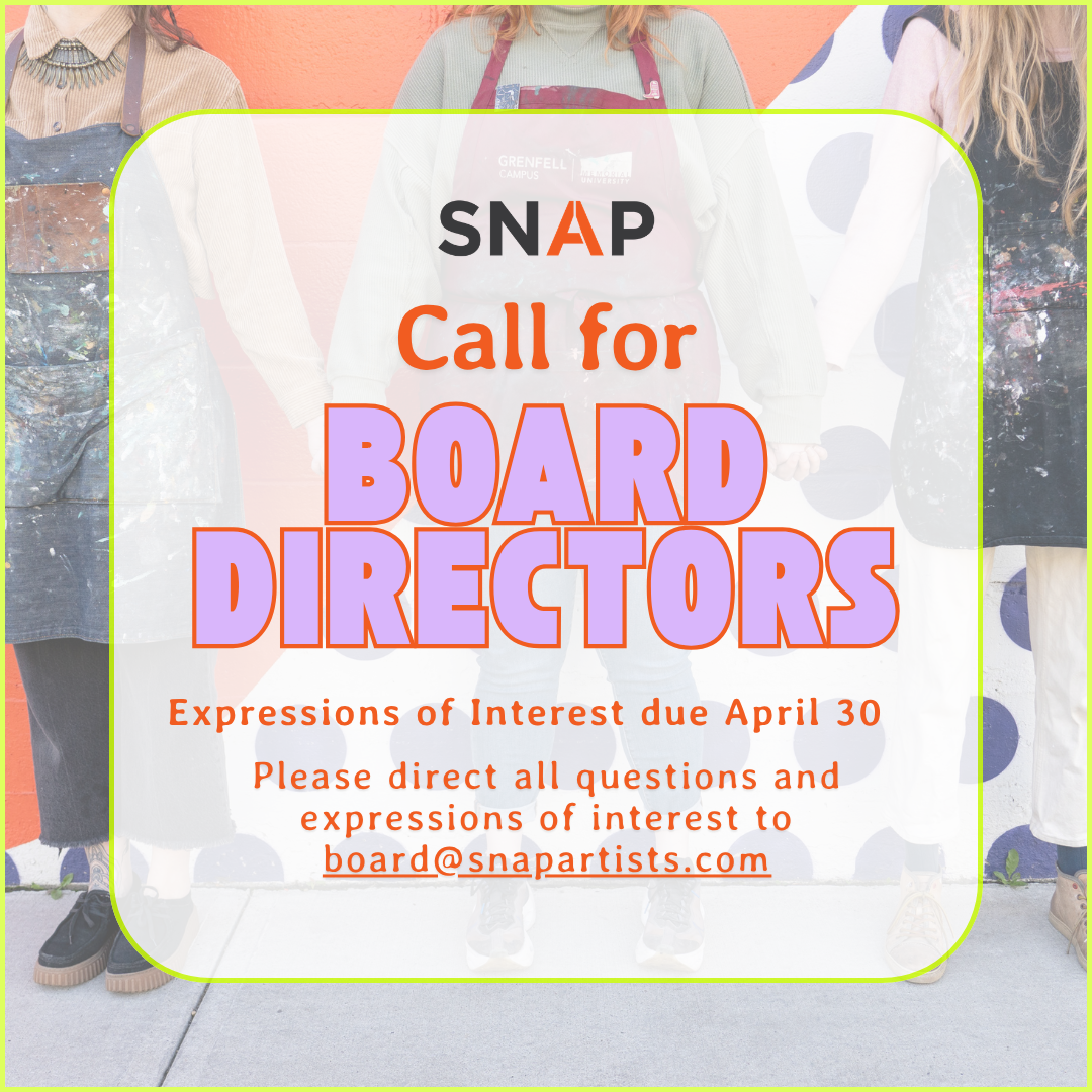 themselves (phone call, letter of interest, video…). Expressions of interest can be sent to our President Kelsey Stephenson at board@snapartists.com, please add “Attn: Join Board” to the email subject line. Alternatively, you may call SNAP directly and be put in touch with our Executive Director Caitlin Bodewitz. We recognize community members may face barriers when applying and if you require accommodations, please contact us by email director@snapartists.com or phone (780-423-1492).